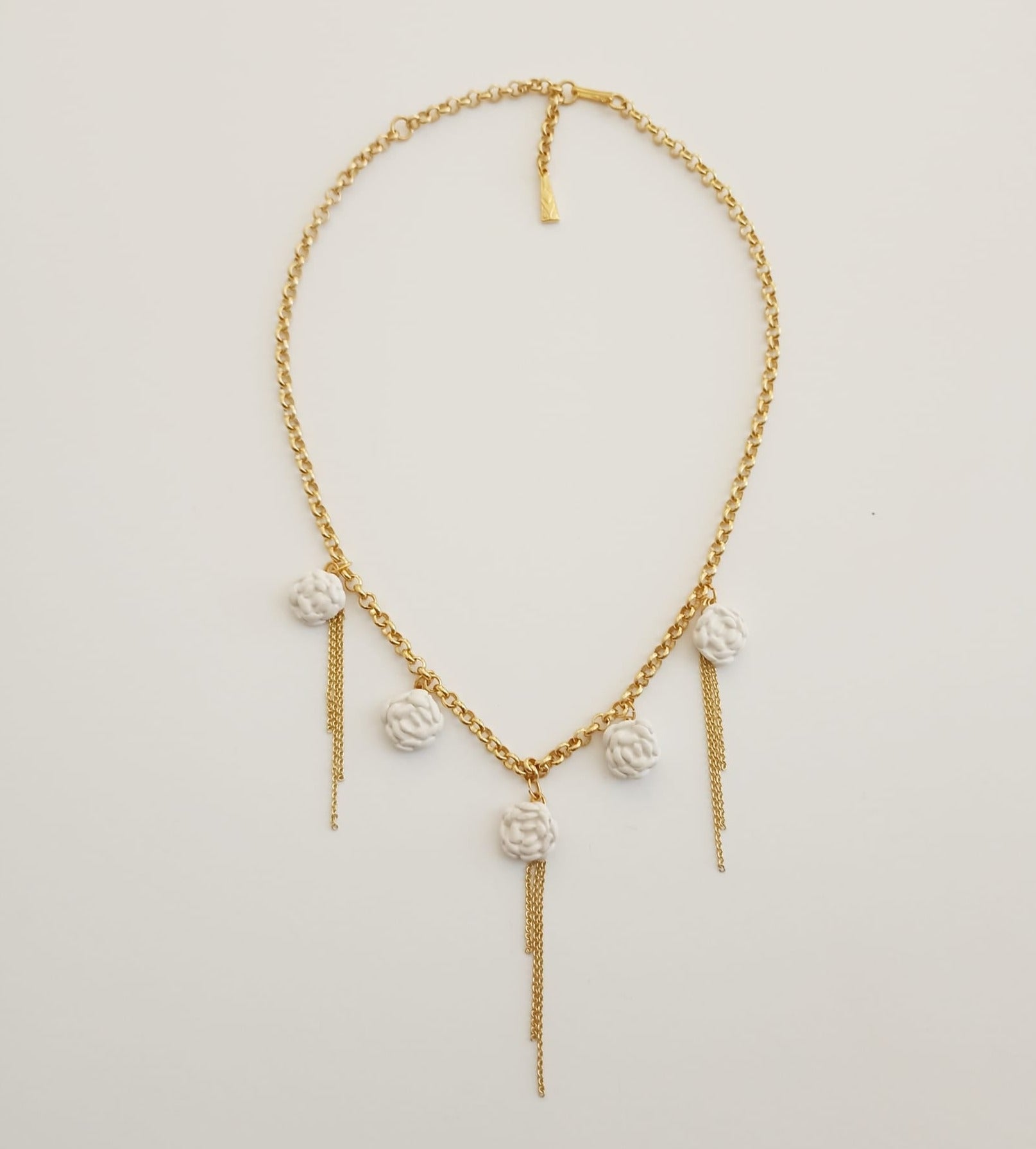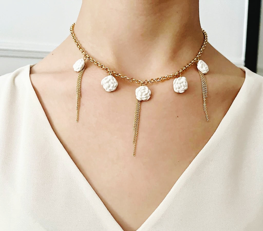 Collar gargantilla con cinco Rosas de Castilla realizadas a mano en cerámica esmaltada con doble cocción en horno a 1060ºC ensamblado en cadenas de latón con baño de oro 24k.