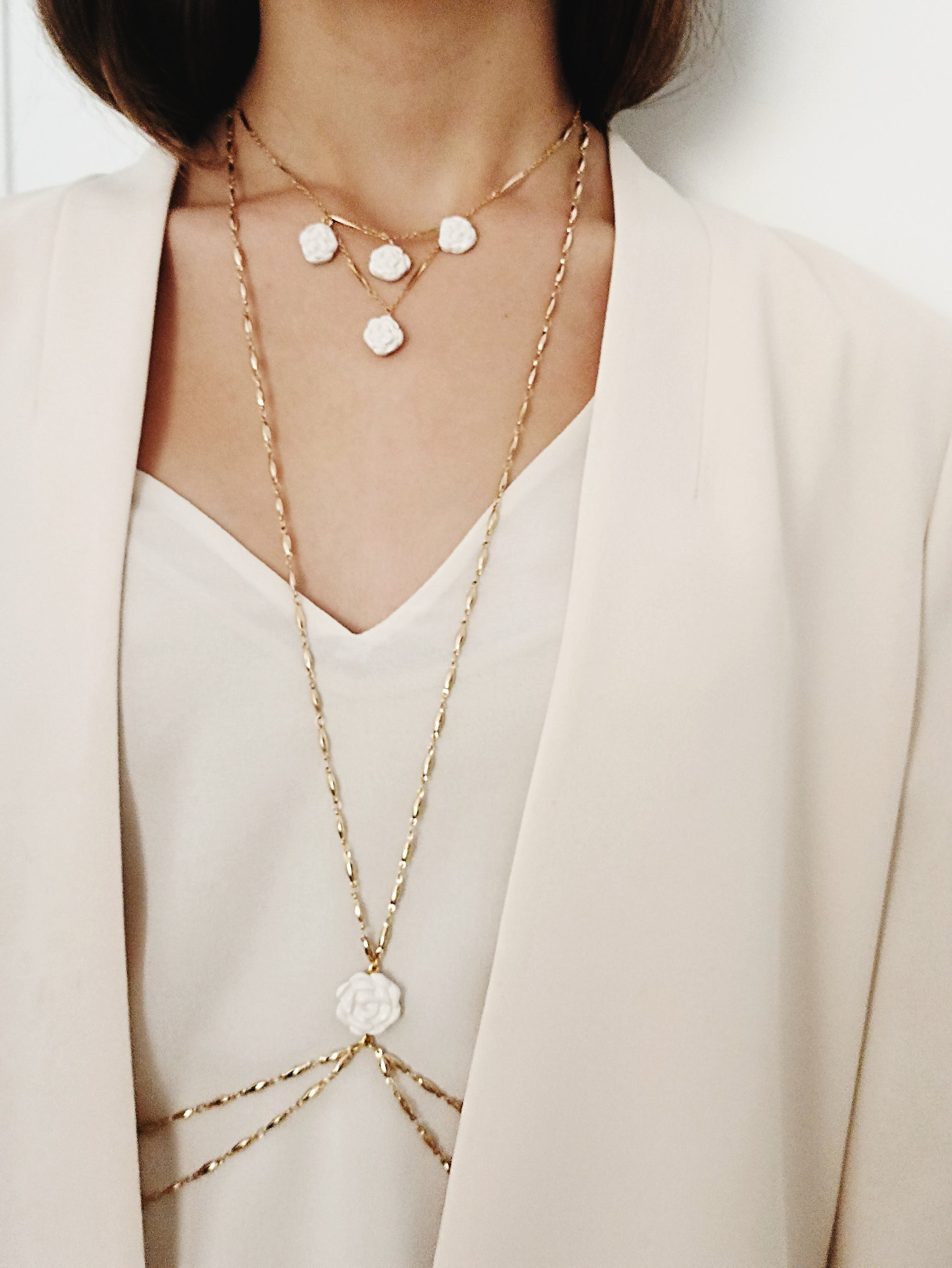 Gargantilla con flores de cerámica esmaltada hecho a mano con doble cocción en horno a 1060ºC y ensamblado en cadenas de latón con baño de oro rosado de 24k.
